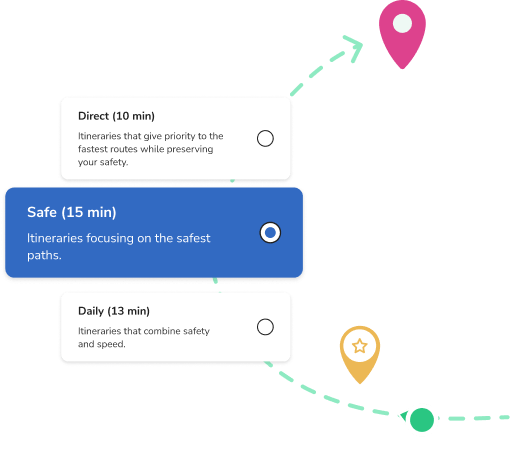 Based on our knowledge of cycling infrastructure, the calculator returns 3 route choices: safe, direct or balanced.