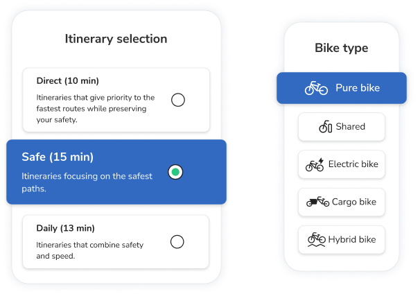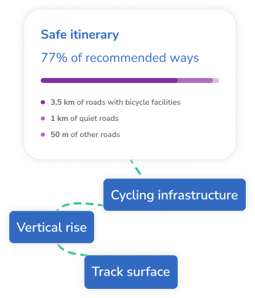 Our 12 years of R&D and our cartographic expertise have enabled us to build a calculator that takes into account 30+ criteria to offer a suitable, reliable and safe route for cyclists.