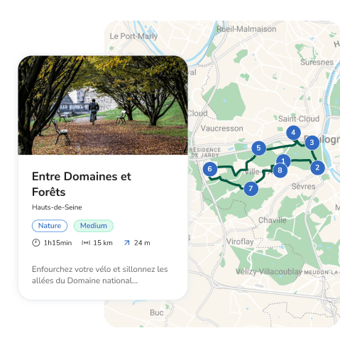 Take advantage of the Geovelo application to highlight short or long distance leisure routes within your territory. Make your routes and POIs easier for cyclists to discover.