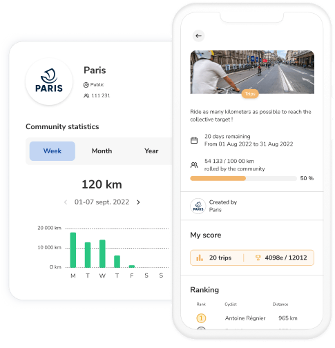 A dedicated space within the application brings together cyclists in your area. Encourage practice through challenges, and highlight your actions through a public news feed.