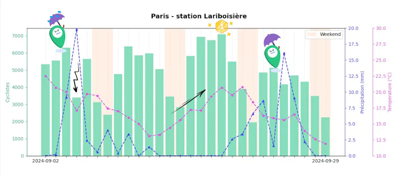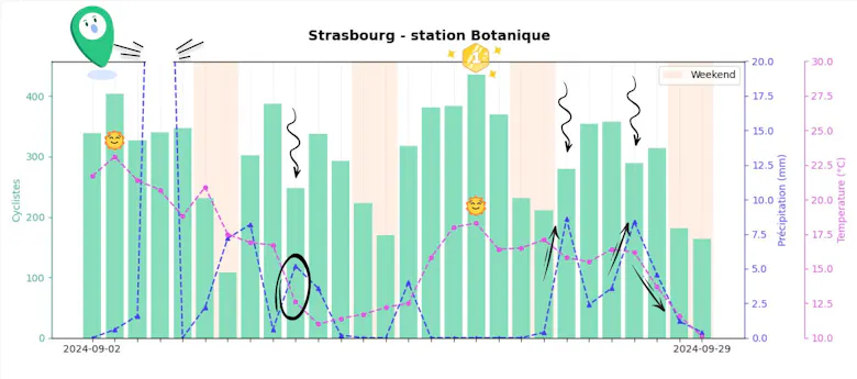 Dès la première semaine de septembre, les averses diluviennes n'ont pas découragé les cyclistes. Les précipitations étaient si abondantes qu’elles ont même dépassé les limites de nos graphiques ! Pourtant, les amateurs de vélo étaient toujours là. Mais avec l'arrivée de la deuxième semaine, la chute des températures et les pluies plus régulières ont ralenti l'élan. Résultat : le mercredi 11, on a observé une baisse de 35 % de fréquentation par rapport à la veille.