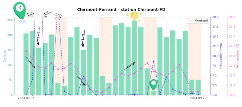 À l’image de Strasbourg, Clermont-Ferrand a été arrosée par une grosse pluie dès la première semaine de septembre. Mais là où les Strasbourgeois ont tenu bon, les Clermontois, eux, ont préféré laisser leurs vélos au garage. Résultat : une baisse de fréquentation de 26 % le mercredi 4 septembre, comparé à la veille.