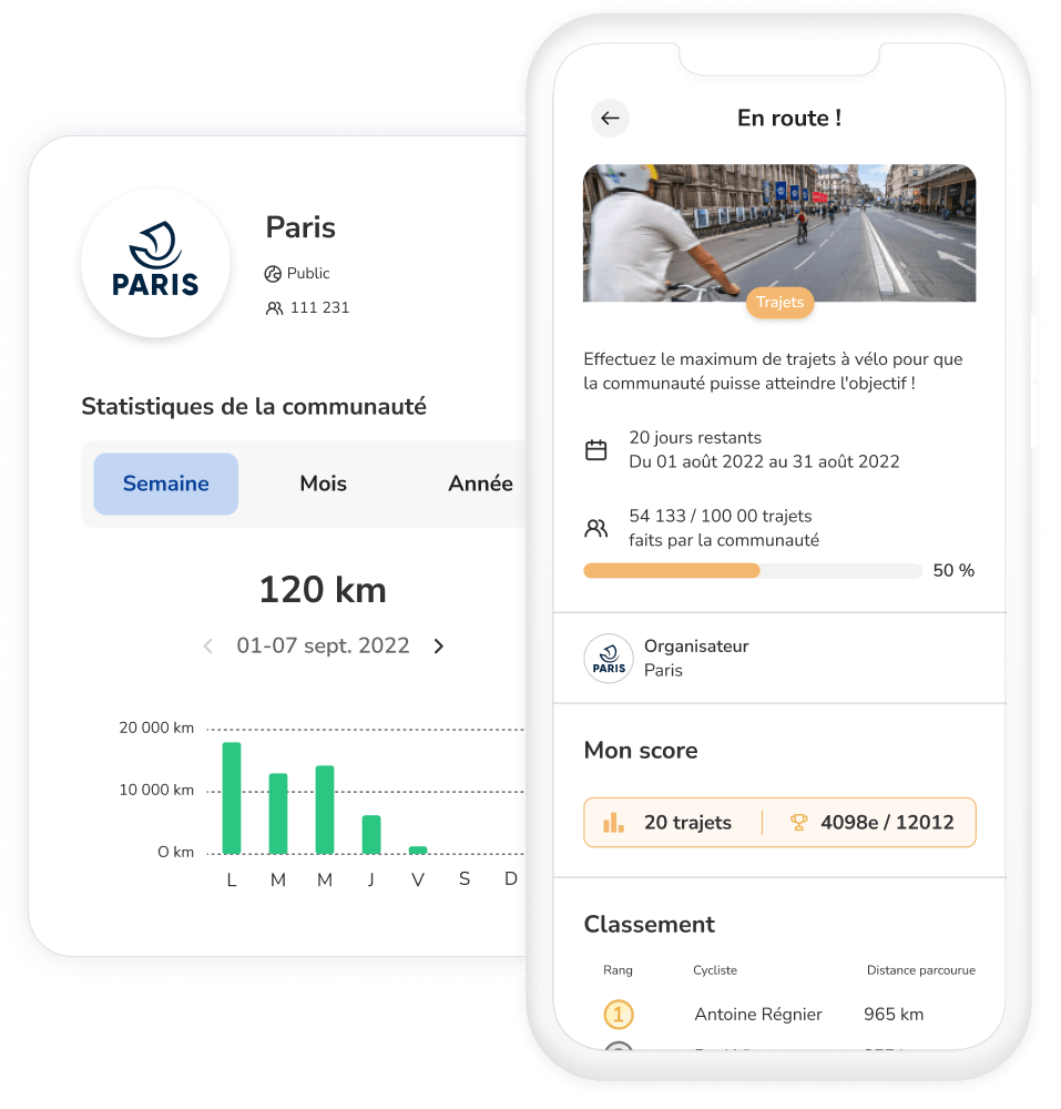Un espace dédié au sein de l'application rassemble les cyclistes de votre territoire. Incitez à la pratique grâce aux challenges d'activité, et mettez en avant vos actions grâce à un fil d'actualité public.